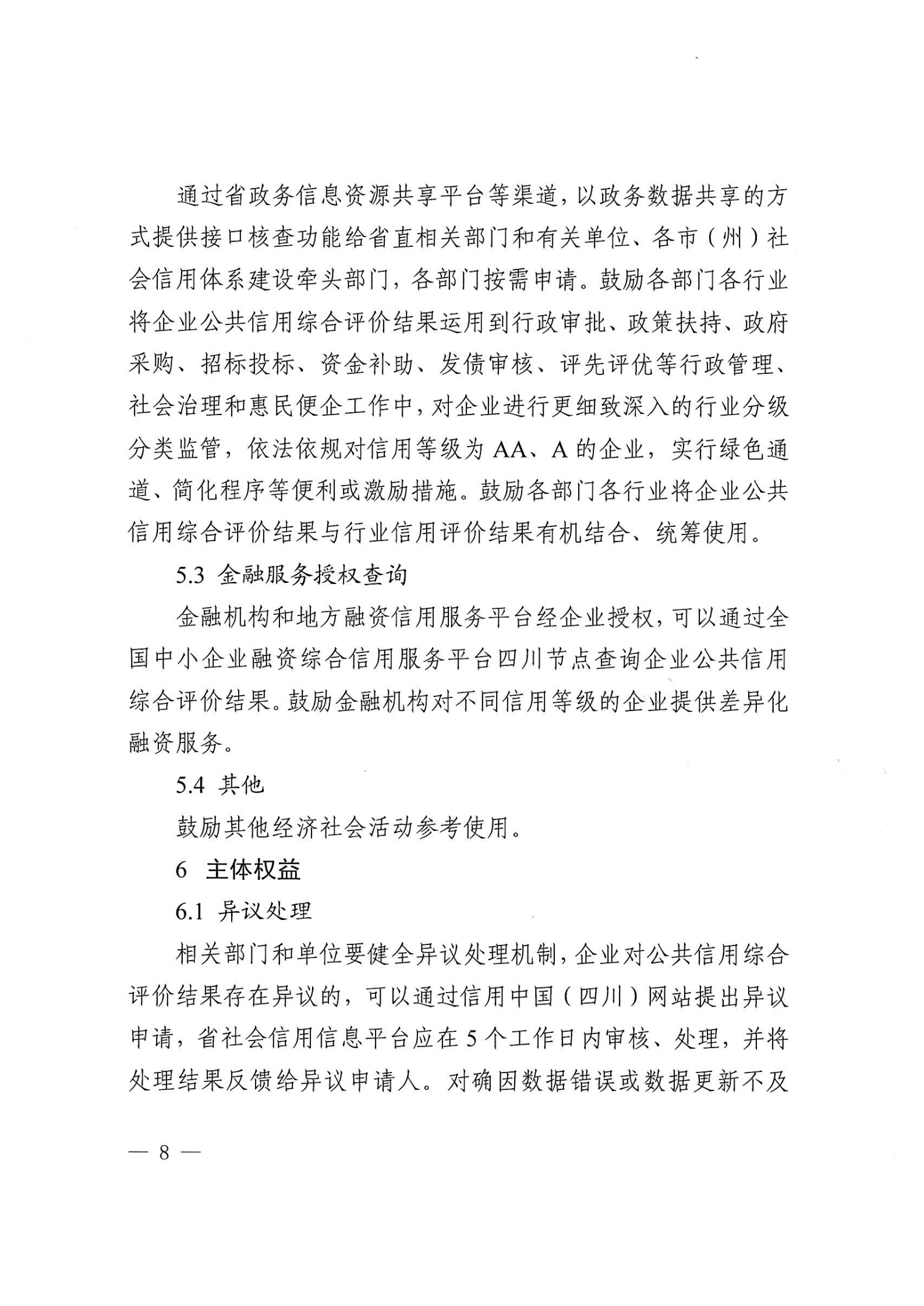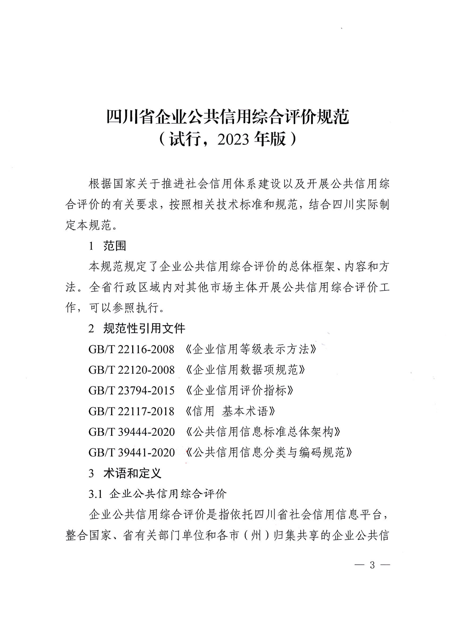 為貫徹落實《中共中央辦公廳國務(wù)院辦公廳關(guān)于推進社會信用體系建設(shè)高質(zhì)量發(fā)展促進形成新發(fā)展格局的意見》(中辦發(fā)〔2022〕25號)《國務(wù)院辦公廳關(guān)于加快推進社會信用體系建設(shè)構(gòu)建以信用為基礎(chǔ)的新型監(jiān)管機制的指導(dǎo)意見》(國辦發(fā)〔2019〕35號)等文件關(guān)于全面建立企業(yè)信用狀況綜合評價體系的要求,充分發(fā)揮信用信息的價值,經(jīng)深入調(diào)查研究和廣泛征求意見,省大數(shù)據(jù)中心、省發(fā)展改革委研究制定了《四川省企業(yè)公共信用綜合評價規(guī)范(試行,2023年版)》?,F(xiàn)印發(fā)給你們,請遵照執(zhí)行。
